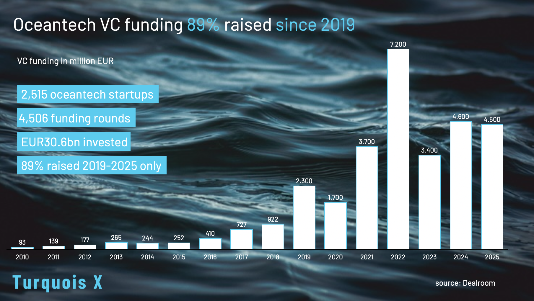 Moreover, nearly 89% of all oceantech venture capital funding has been raised since 2019, contributing to a total investment of EUR 30.6 billion in the sector.[5] This demonstrates that oceantech is a new and young investment sector with increasing investor recognition and tremendous venture capital opportunities.